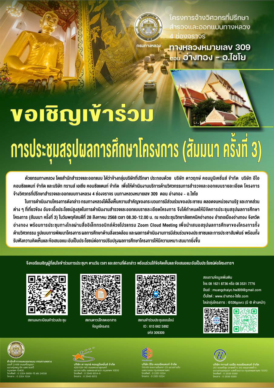 ด้วยเหตุนี้ กรมทางหลวง โดยสำนักสำรวจและออกแบบ จึงได้ว่าจ้างกลุ่มบริษัทที่ปรึกษา ประกอบด้วย บริษัท ดาวฤกษ์ คอมมูนิเคชั่นส์ จำกัด บริษัท อีไอ คอนซัลแตนท์ จำกัด และบริษัท ทรานส์ เอเชีย คอนซัลแตนท์ จำกัด ให้ดำเนินโครงการจ้างวิศวกรที่ปรึกษาสำรวจและออกแบบทางหลวง 4 ช่องจราจร บนทางหลวงหมายเลข 309 ตอน อ่างทอง – อ.ไชโย เพื่อเชื่อมโยงโครงข่ายการคมนาคมขนส่ง อำนวยความสะดวก เพิ่มความคล่องตัวในการเดินทาง ตลอดจนยกระดับคุณภาพชีวิตของประชาชนและกระตุ้นเศรษฐกิจในพื้นที่